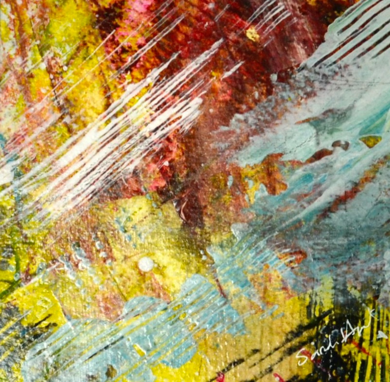 Original small abstract artworks, acrylic and ink mixed media influenced by light and texture. A small perfectly formed colourful piece ready to adorn any wall in your home. These pieces have been inspired by the beautiful landscapes around me and created using layers of acrylic paint and black ink with rich and vibrant colours producing a dramatic finish.
