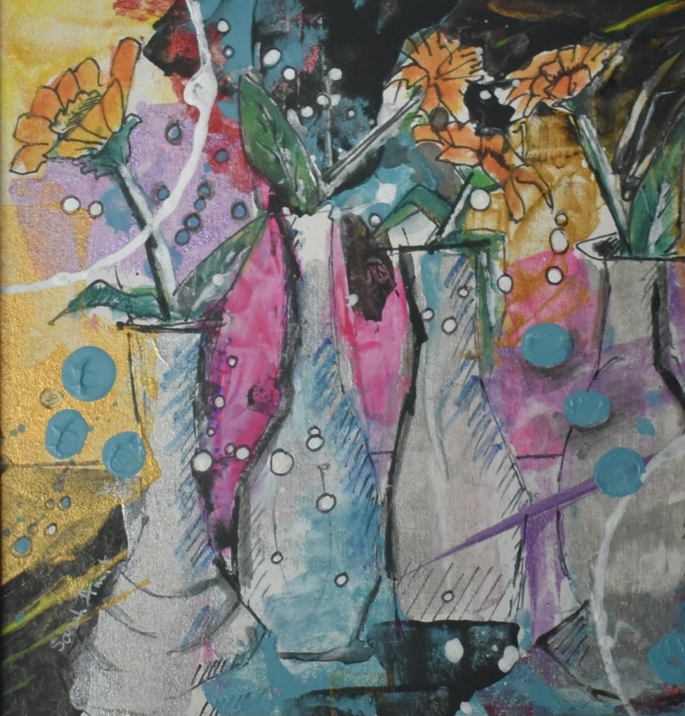 Original small abstract artworks, acrylic and ink mixed media influenced by my love of flowers. A small perfectly formed colourful piece ready to adorn any wall in your home. Created using layers of acrylic paint and black ink with rich and vibrant colours producing a dramatic finish.